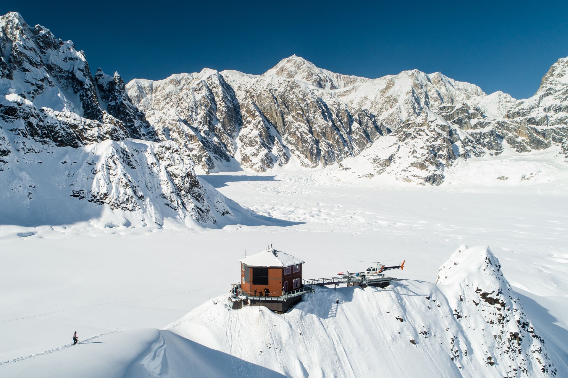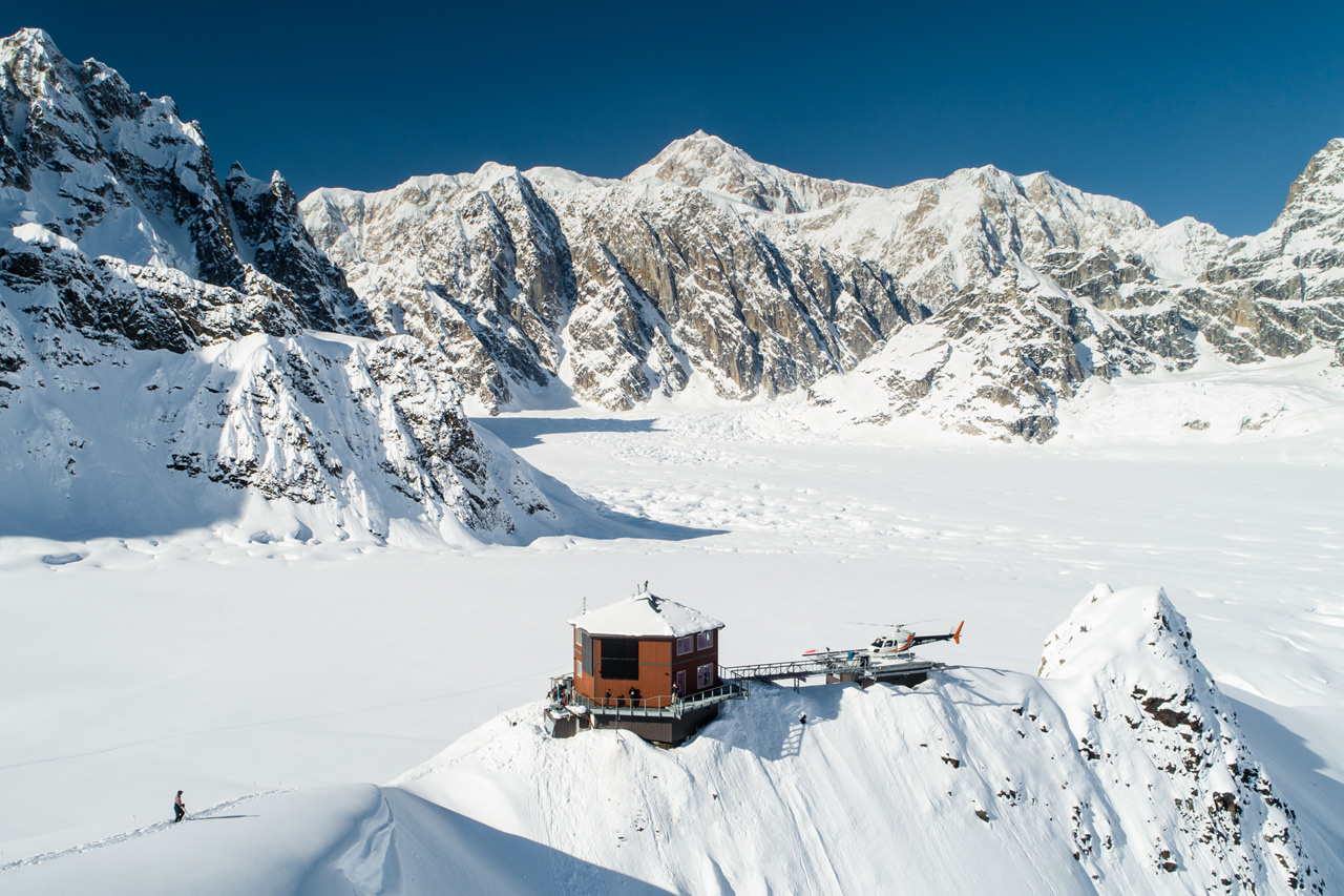 "The lodge sits 6,000 feet above sea level, atop a granite outcrop and amid a 35-square-mile snowfield amphitheater, offering knockout views of the peak of Denali—North America’s highest mountain—only ten miles to the northwest. But it’s not just the setting and vistas that impress. The five-bedroom, hexagonally shaped, eco-conscious chalet sleeps ten in plush digs and comes with an expert staff of two guides, a chef, and a concierge."