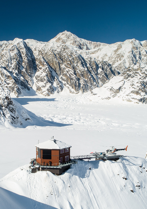 Sheldon Chalet is perched on a nunatak in the Don Sheldon Amphitheater of Denali's magnificent Ruth Glacier, just 10 miles from the summit. Air transportation is the only way to reach the chalet and the closest town of Talkeetna is 55 air miles away.