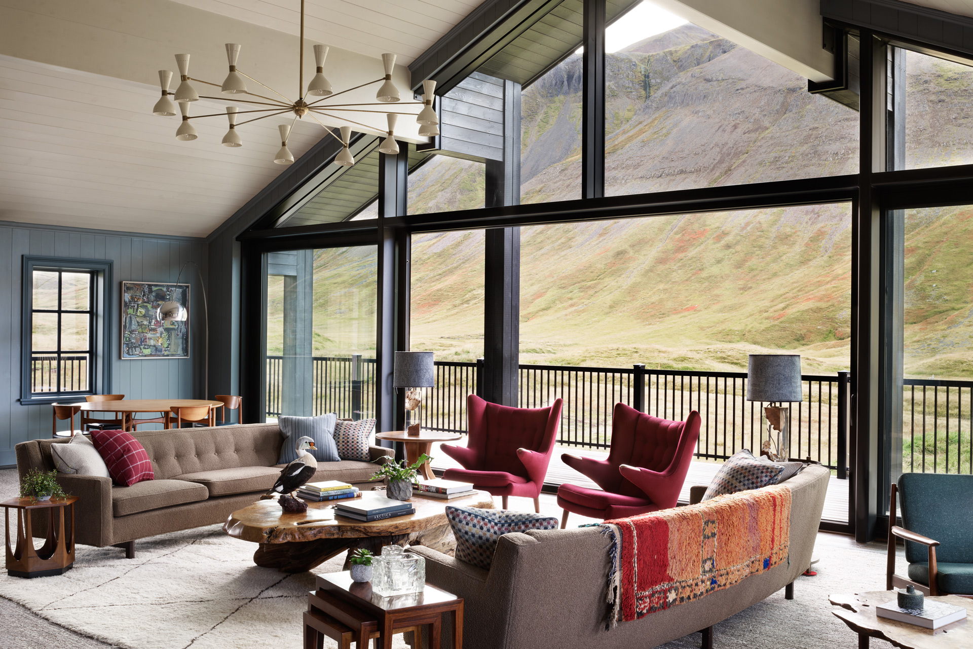 Deplar Lodge has a stylish lounge with a large fireplace and captivating mountain views. A large bar area for the all important cocktails, and equipped with a TV, pool table, foosball and darts, provides plenty of entertainment. After dinner, guests can take to the stage in the bar's loft, which is equipped with band instruments and karaoke facilities. The dining room, framed by magnificent views, has a fireplace as well as a taxidermy Icelandic bird collection. You can also relax in the library or enjoy a film in the media room, which is complete with game consoles, Apple TV and Netflix.