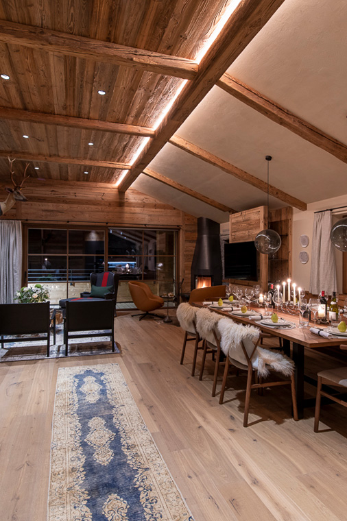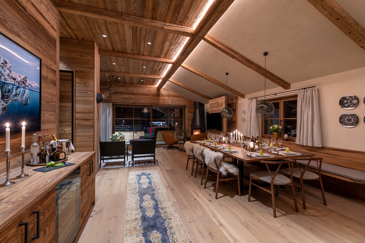 Set over three floors, the ultra-stylish apartment can be accessed via stairs or a lift. The top floor of the chalet is home to an open plan living, dining and kitchen area which opens onto the terrace. A wood-burning stove in the corner of the living room creates a cosy atmosphere and is perfect for relaxing next to after a day on the slopes.