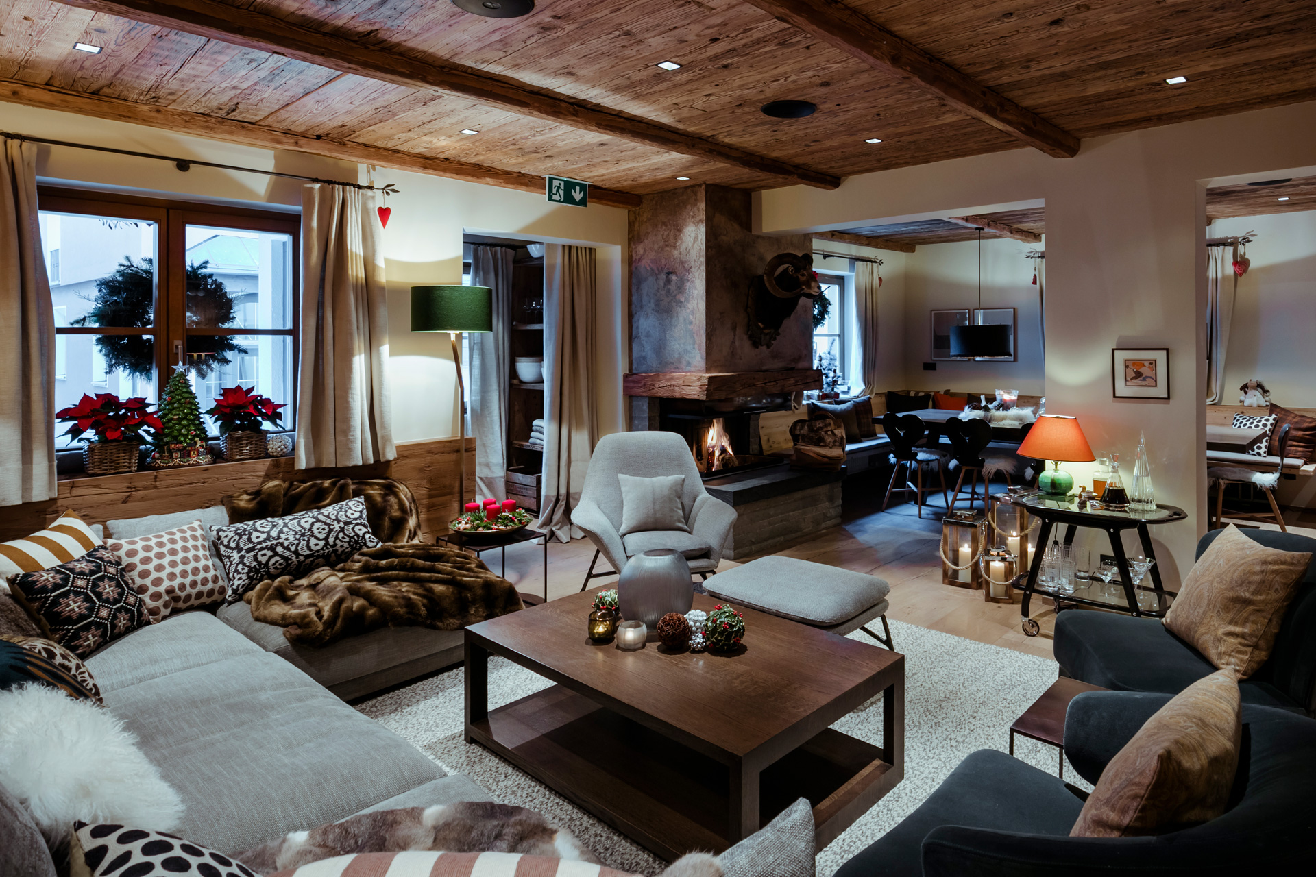 The living area has vintage wood paneling, a roaring fire and hunting trophies with touches of modern design. Beautiful glassware, delicate lighting and valuable pieces of art enhance the lounge and the stairwell. The open plan living area also includes a fully-equipped open Gaggenau kitchen and the dining table seating up to 16 guests.