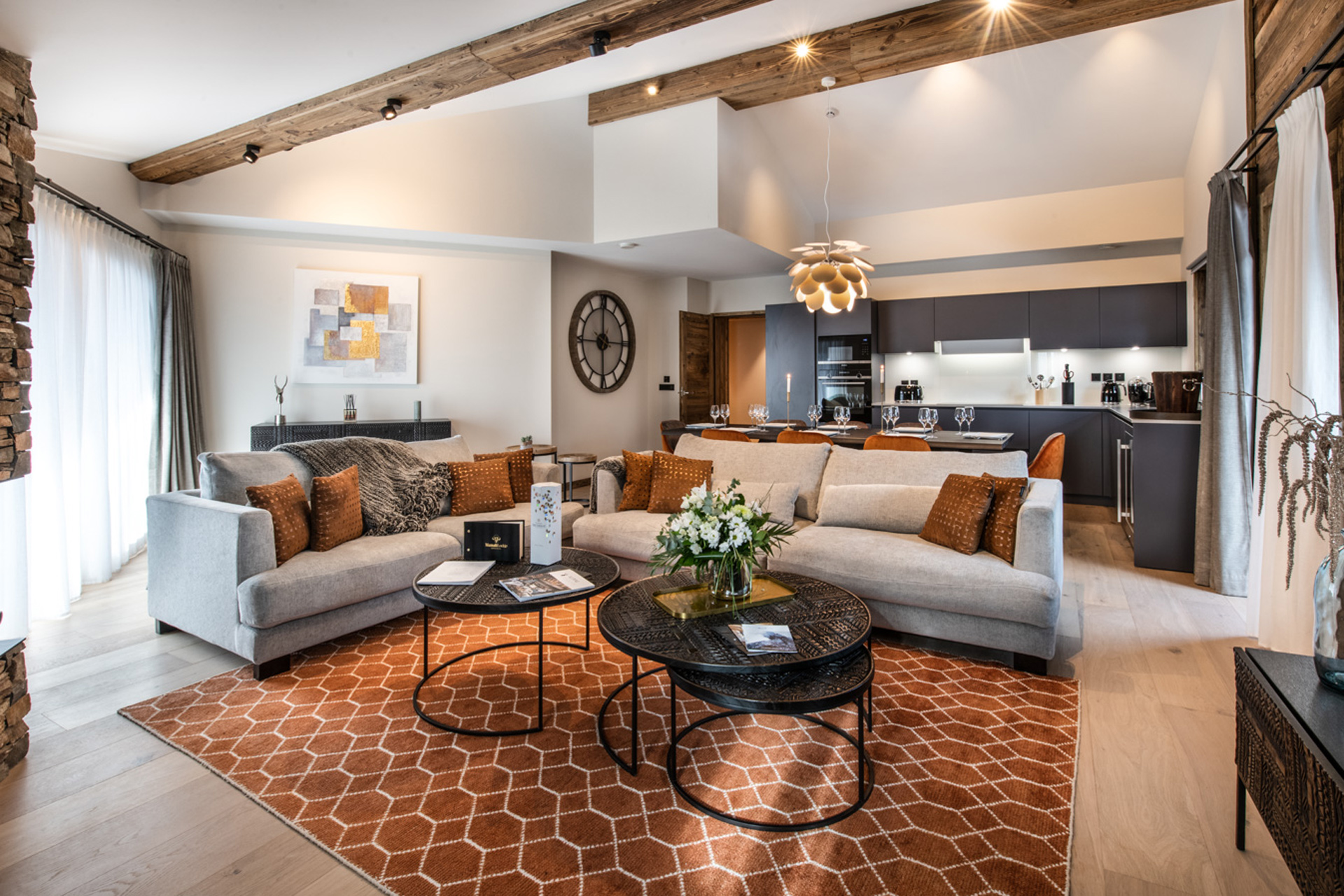 Unwind with a book next to the log-burning fireplace, enjoy the company at the elegant dining table, and admire the balcony’s mountain views.