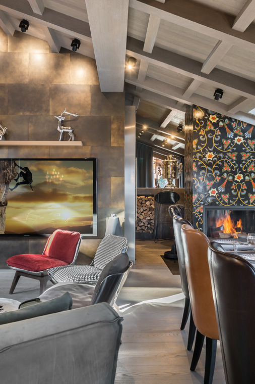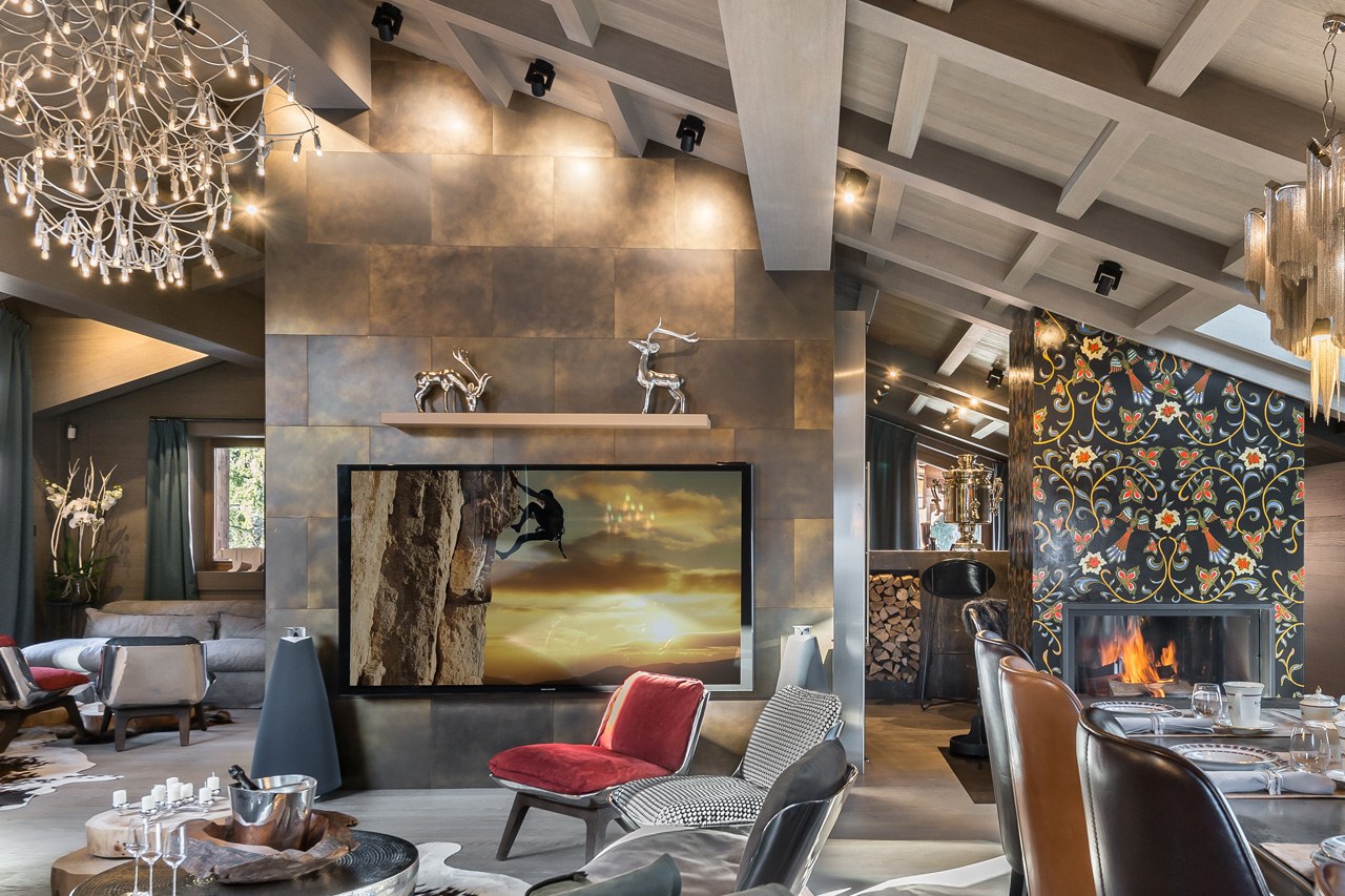 Traditional chalet style elements such as natural upholstery, wooden floors, walls and furniture feature throughout the interior. To give the chalet its distinctive Russian feel, the designers have used real fur for drapery, ethnic Russian patterns for the fireplace chimney, and gold leaf coverings for chandeliers and floor lamps.
