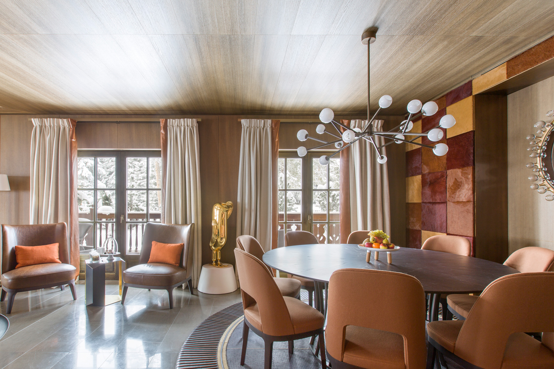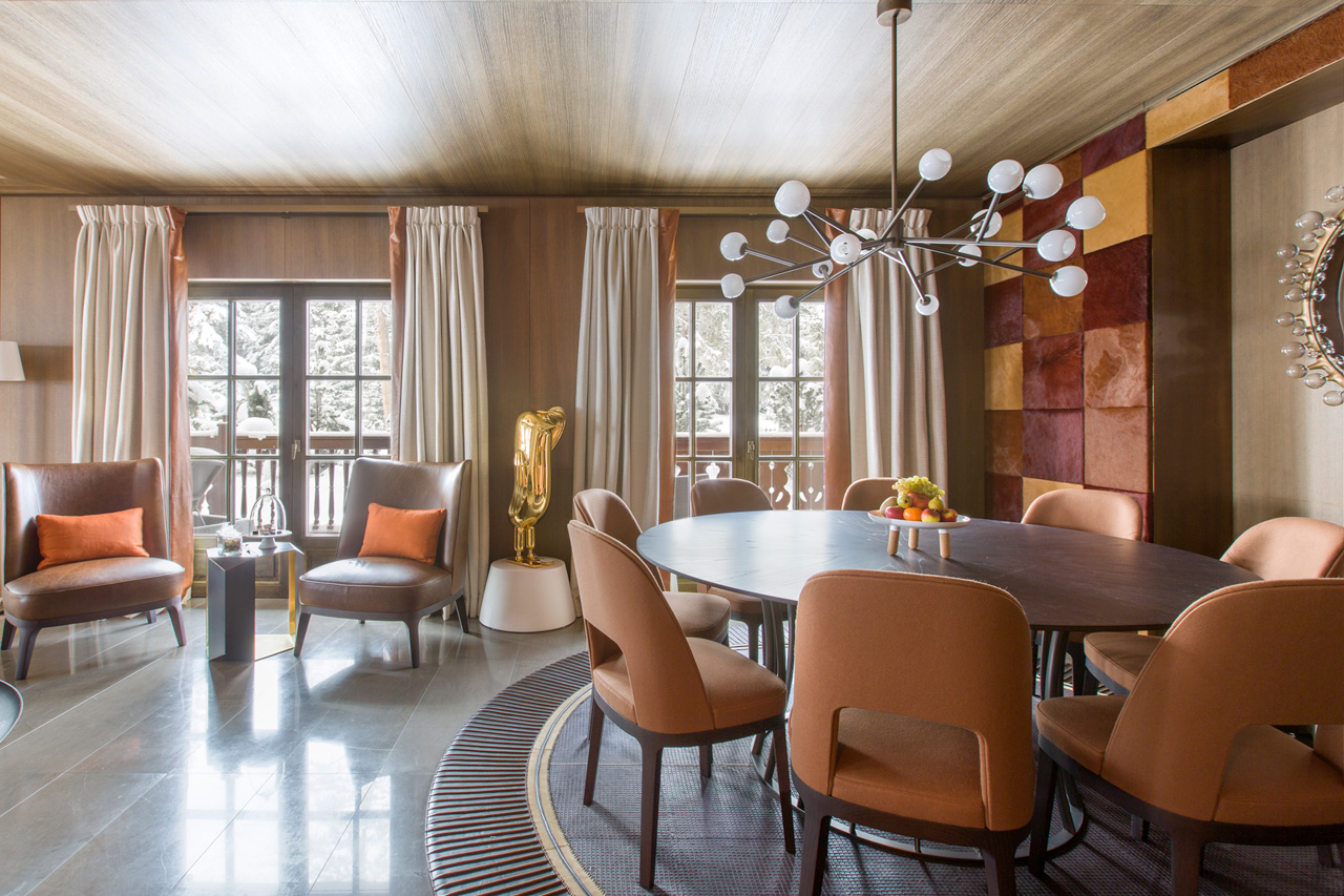 Le Chalet Cheval Blanc’s interiors combine authentic materials with original art pieces. The living areas are all about relaxing together.