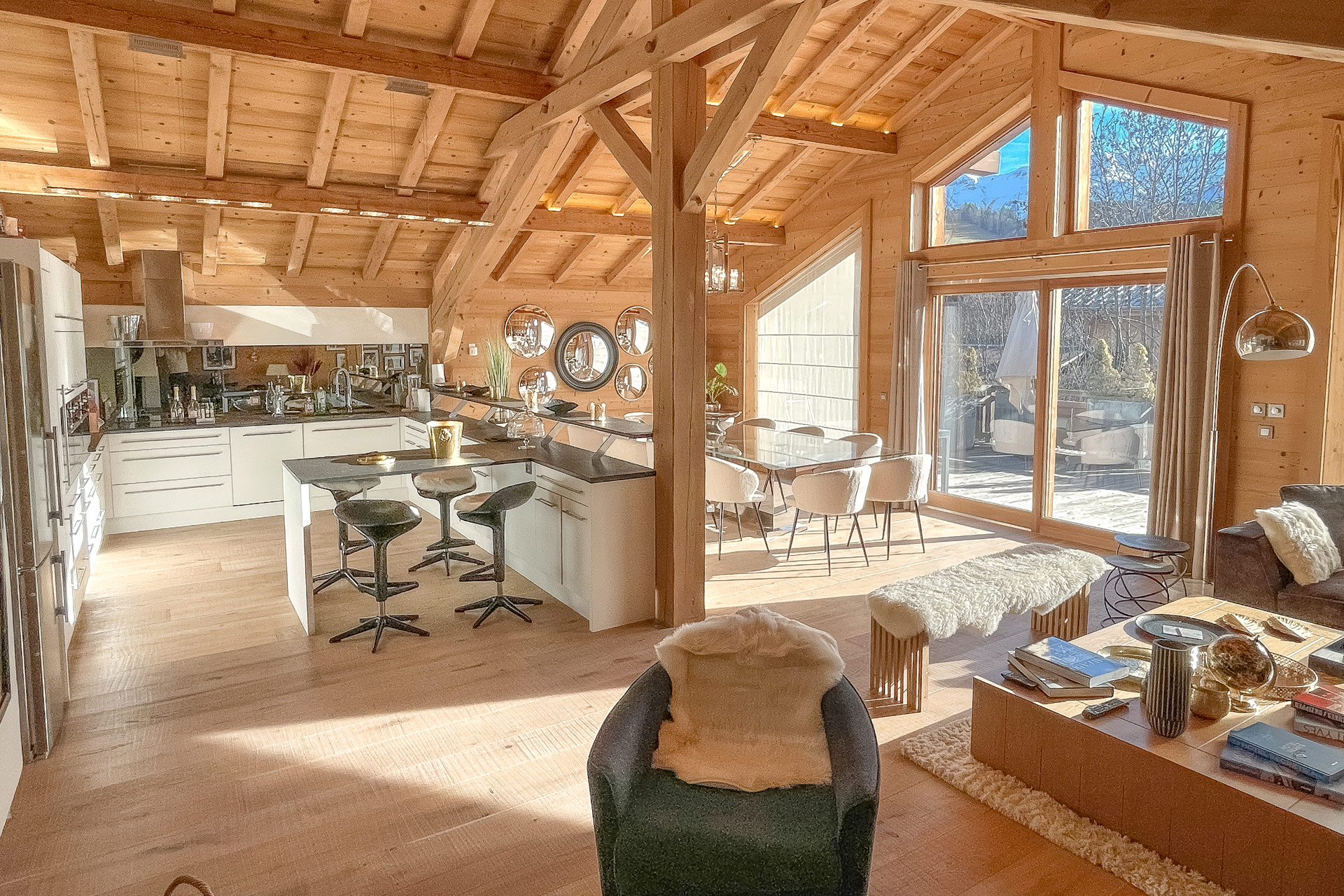 Set beneath vaulted ceilings, the living area on the second floor is both bright and inviting. Expansive floor-to-ceiling windows frame the surrounding views and fill the space with natural light, while wooden finishes throughout create a classic alpine atmosphere.