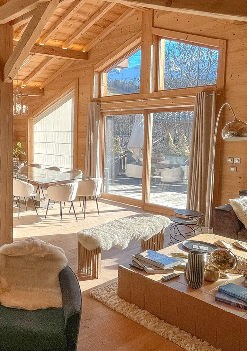 Chalet Allobroges combines light-filled living spaces, warm wooden interiors, and private wellness facilities for a relaxing mountain escape.