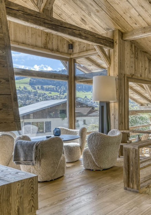 An elevator serves all levels of the chalet, leading up to the impressive living area. Bathed in natural light, the space is surrounded by floor-to-ceiling windows, perfectly framing the sweeping alpine views.