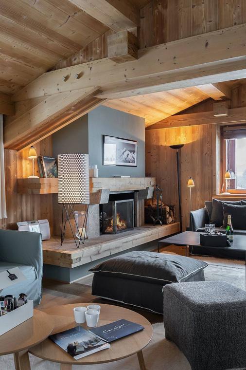 The inviting living space on the top floor is stylish yet cosy, featuring soft, luxurious fabrics, wood panelling, and a granite fireplace surrounded by plush sofas.