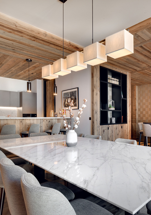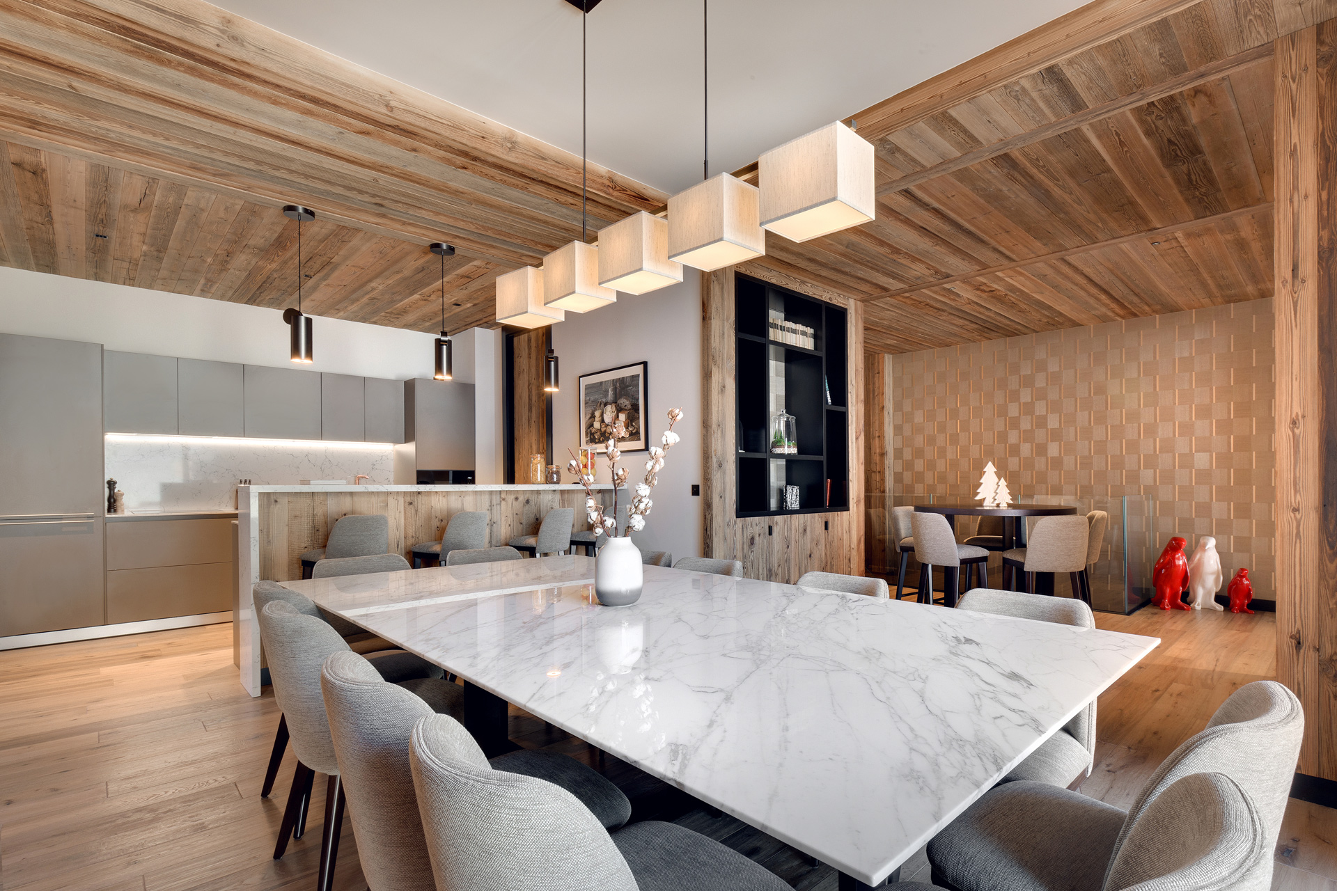 The duplex offers a range of entertainment spaces, with a separate family room on the lower floor providing a cosy setting to watch a film on deep, comfortable sofas, alongside a dedicated area for younger children to play. Also on the lower floor, a private spa area offers true indulgence, with a sauna and hammam leading off the fitness room, in addition to a dedicated massage room. For a more extensive spa experience, the shared residence spa includes a 25m indoor pool, multi-temperature pools, a salt grotto, sauna and hammam, beauty clinic, ice fountain, ten treatment cabins, private relaxation cocoons, an Alpine herbal tea room, and a cryo suite.