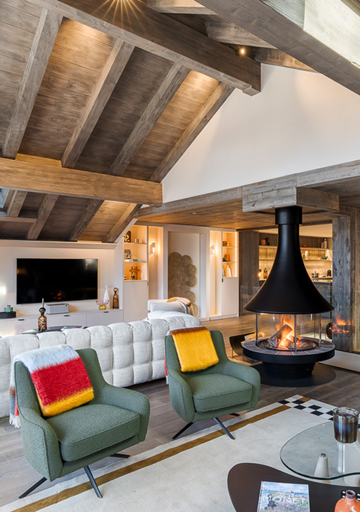 A lift serves three of the four floors, with the open-plan living area found on the first floor, forming the heart of the chalet. Exposed beams and vaulted ceilings create a bright and spacious atmosphere, while large floor-to-ceiling windows open onto a balcony framing the stunning valley views.