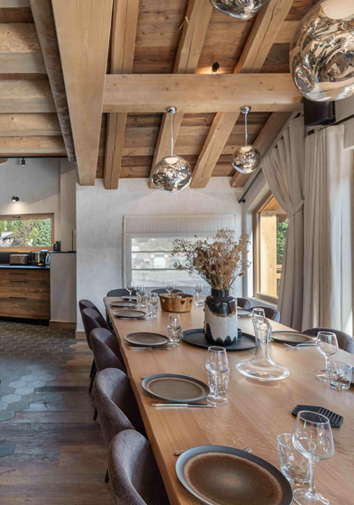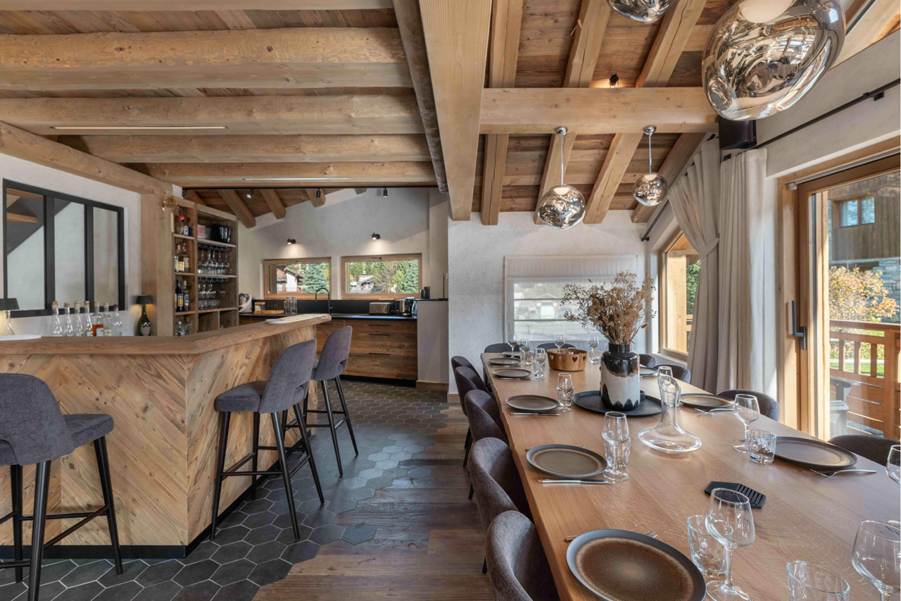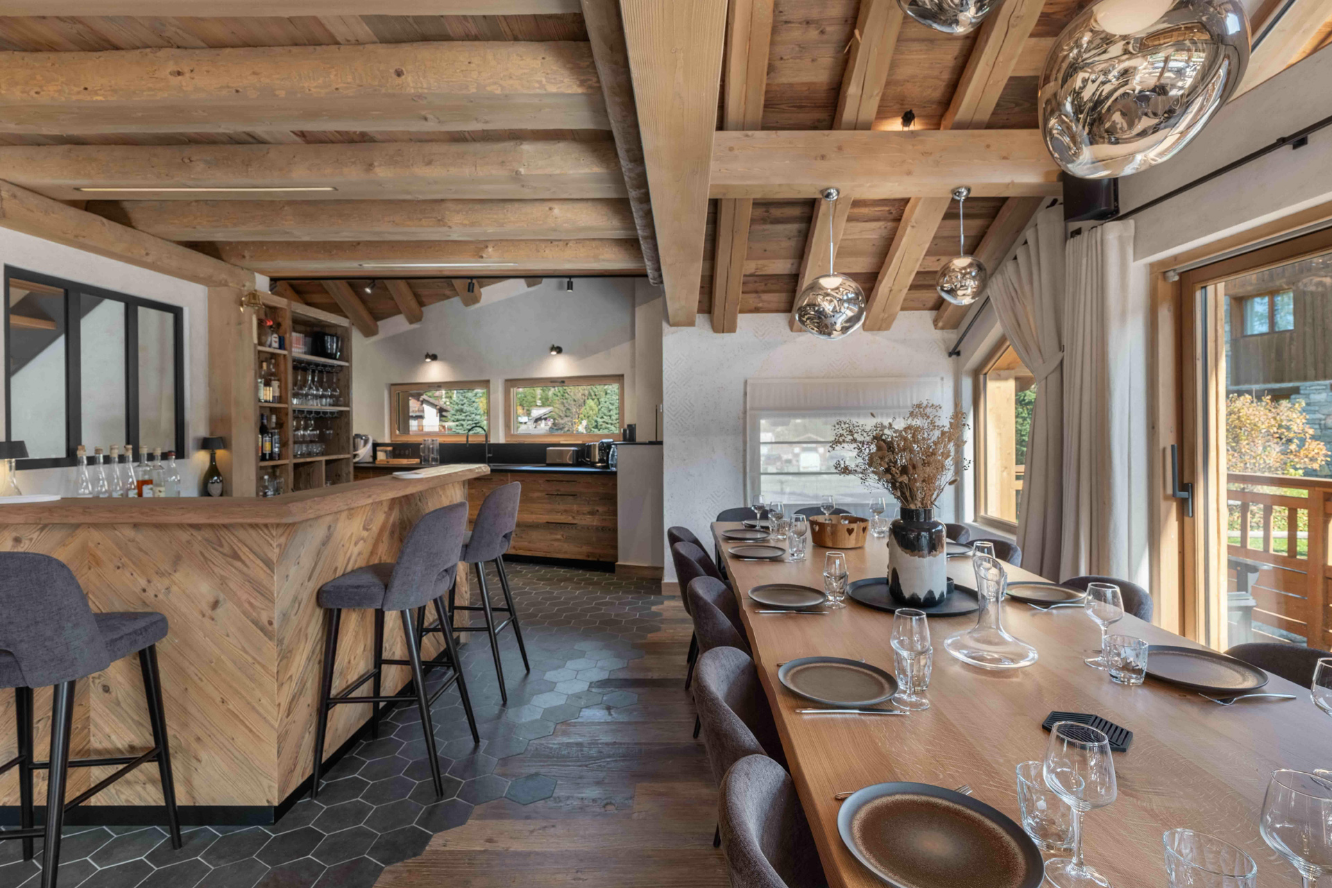 Inside the chalet, vaulted ceilings and light wood finishes create a warm, homely atmosphere, allowing guests to truly unwind after a day on the slopes. On the first floor, the open-plan living area features generous spaces with a wood-burning fireplace and TV. A large dining table sits alongside the bar area, creating the perfect
