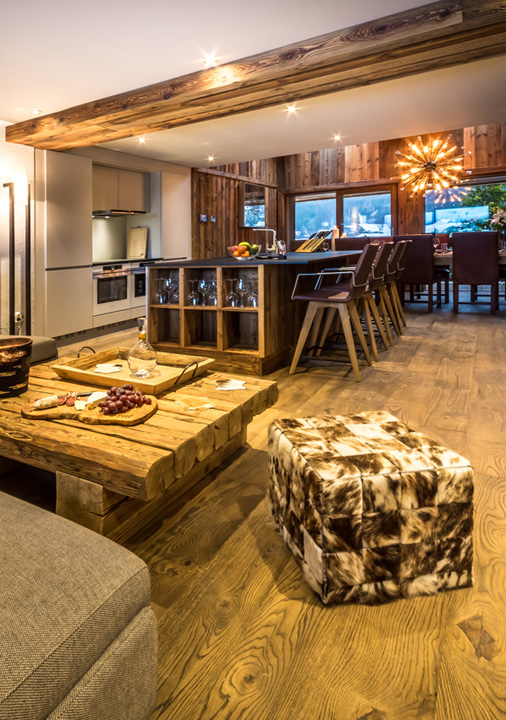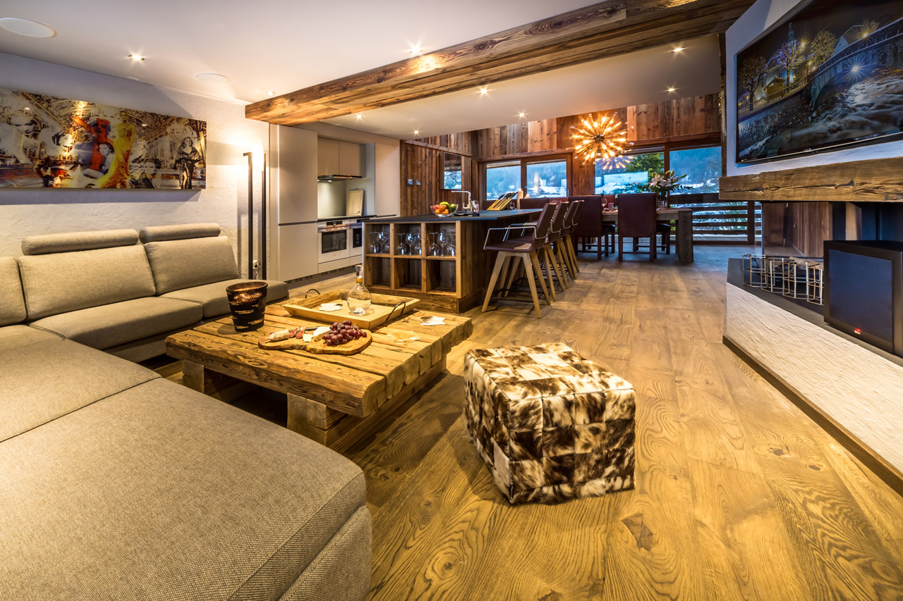 The chalet’s alpine character is reflected in its traditional wooden exterior, while large windows flood the open-plan living area with light and frame the mountain views.