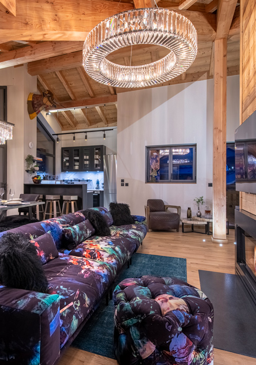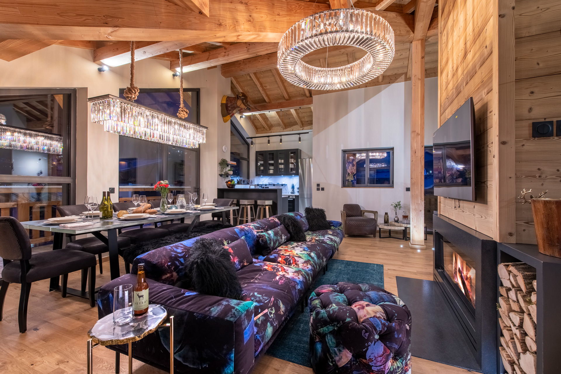 Set over two floors, the main living space is located on the top floor. Open-plan, the living area is home to a feature fireplace and floor-to-ceiling windows which provide a gateway to wonderful views over the village and surrounding mountains. Offset from the living room is a separate bespoke bar and mezzanine area, perfect for hiding away
