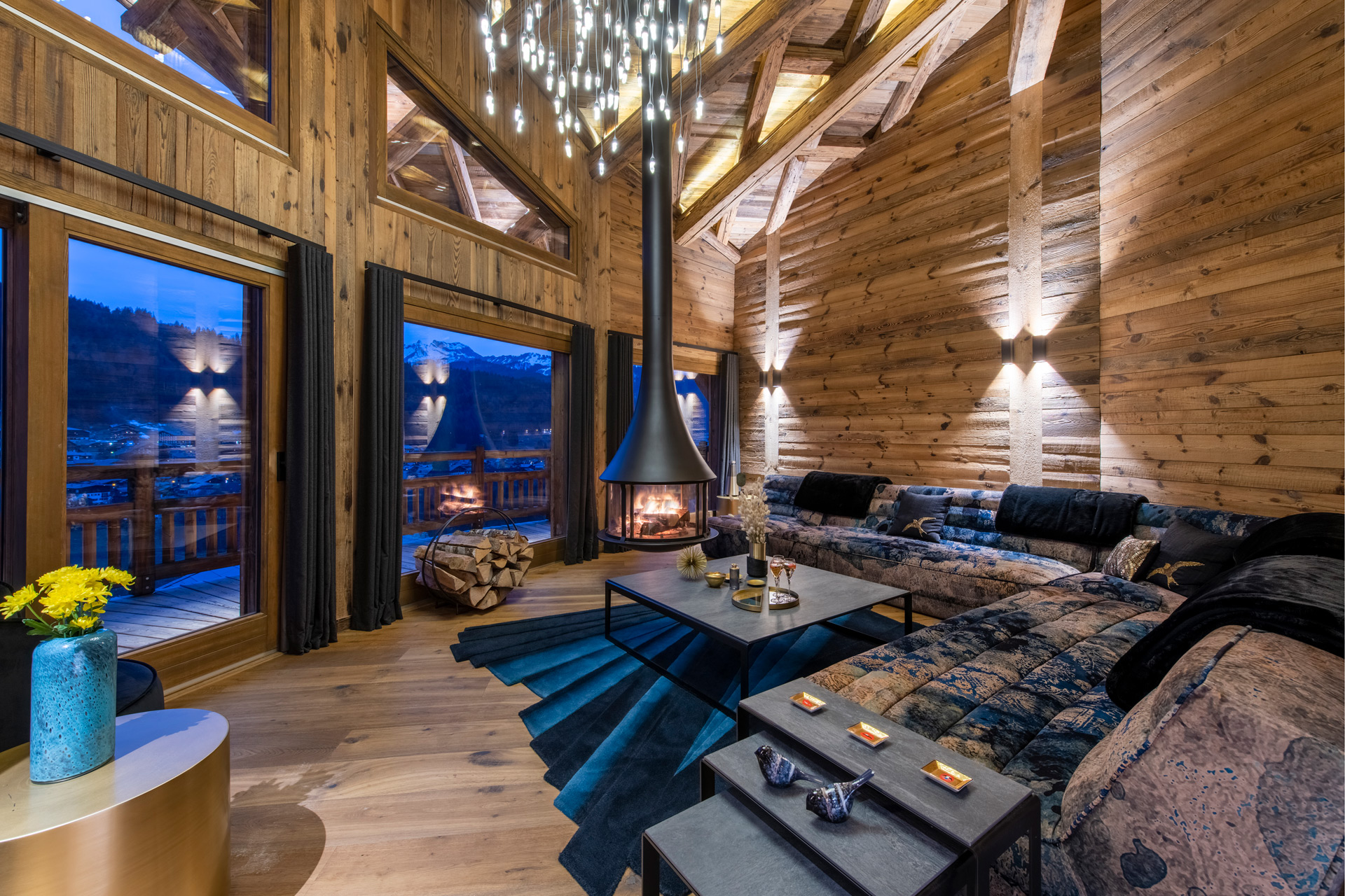 Guests enter the property on the ground floor, where there is a ski room with heated boot warmers. An elevator whisks you up to the spacious open plan living, dining and kitchen area on the third floor. With a wood-burning fireplace, epic views and comfortable sofas, this is the perfect space to relax together after a day on the mountain. Doors open onto a large south-facing balcony, complete with Shep & Kyle's signature swings.