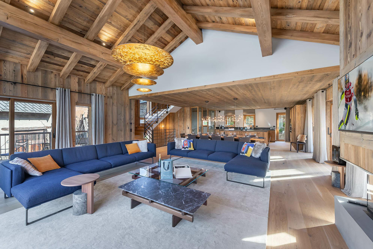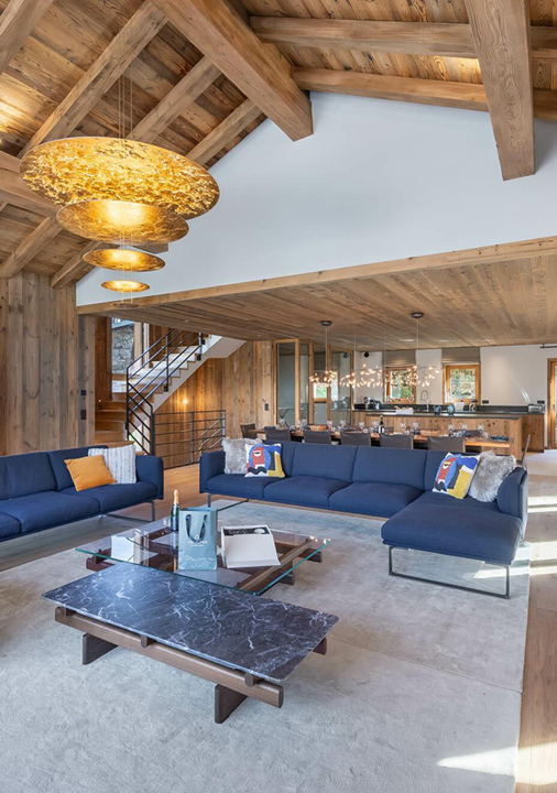 The chalet has a stunning, light and spacious living area set on the third level. Sofas are gathered around the fireplace, there's an elegant dining table and a modern, fully-equipped kitchen too. From here, doors slide open giving you access to a balcony with exceptional mountain views.