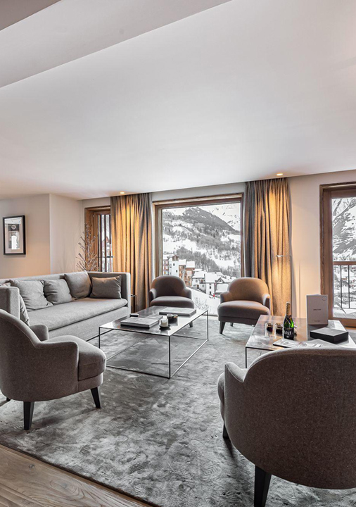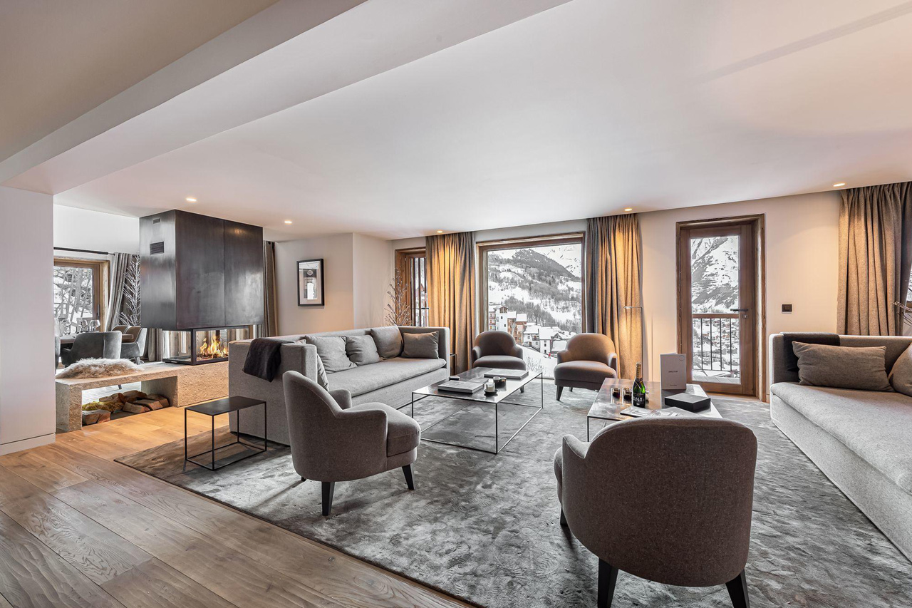 room. Doors open onto an extensive balcony from where you can admire the wonderful views of the surrounding peaks. Just off the living area is a cosy TV snug with Apple TV - an ideal spot to unwind after a day's skiing.