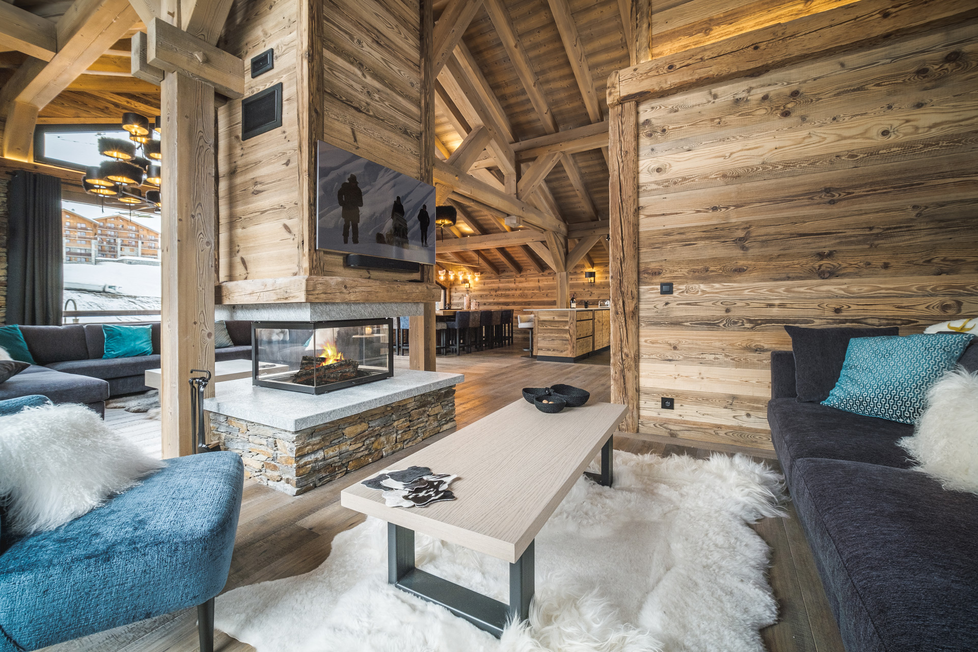 The main living area is open plan, light and spacious with a striking glass-sided fireplace at its centre. Here you can relax on comfortable sofas beside the fire, enjoy meals around the large dining table