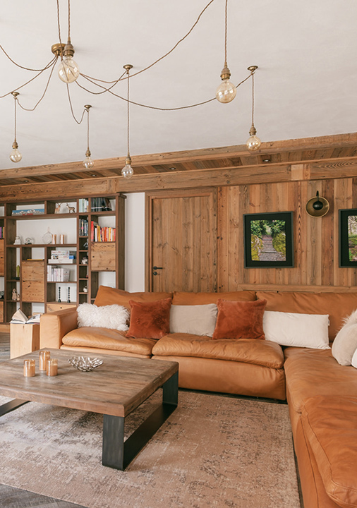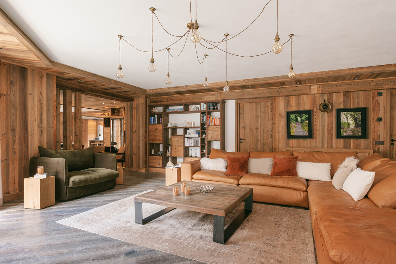 seating ten guests, opens onto a balcony with beautiful alpine views, while the adjoining modern kitchen includes bar seating and high-quality appliances. The space leads through to the seating area, where soft furnishings and gentle lighting create a serene atmosphere to relax and enjoy the surroundings, with access to both a balcony and terrace.