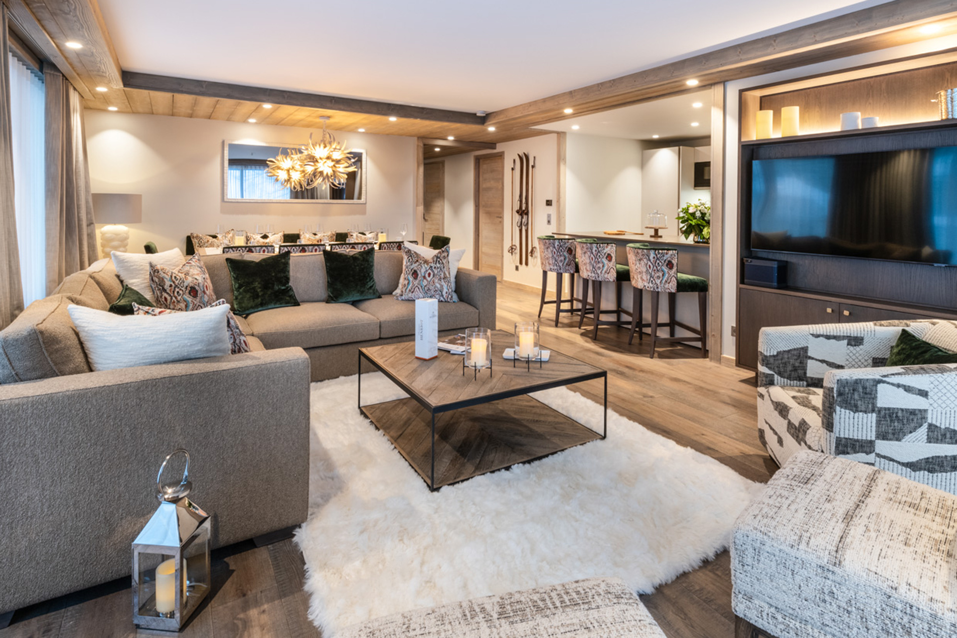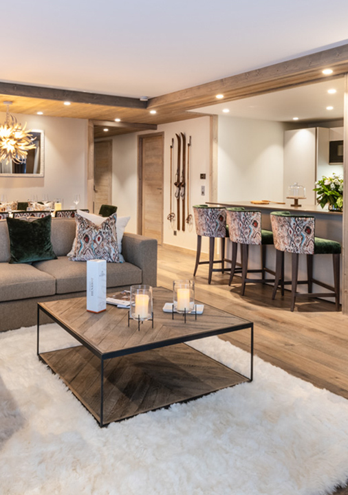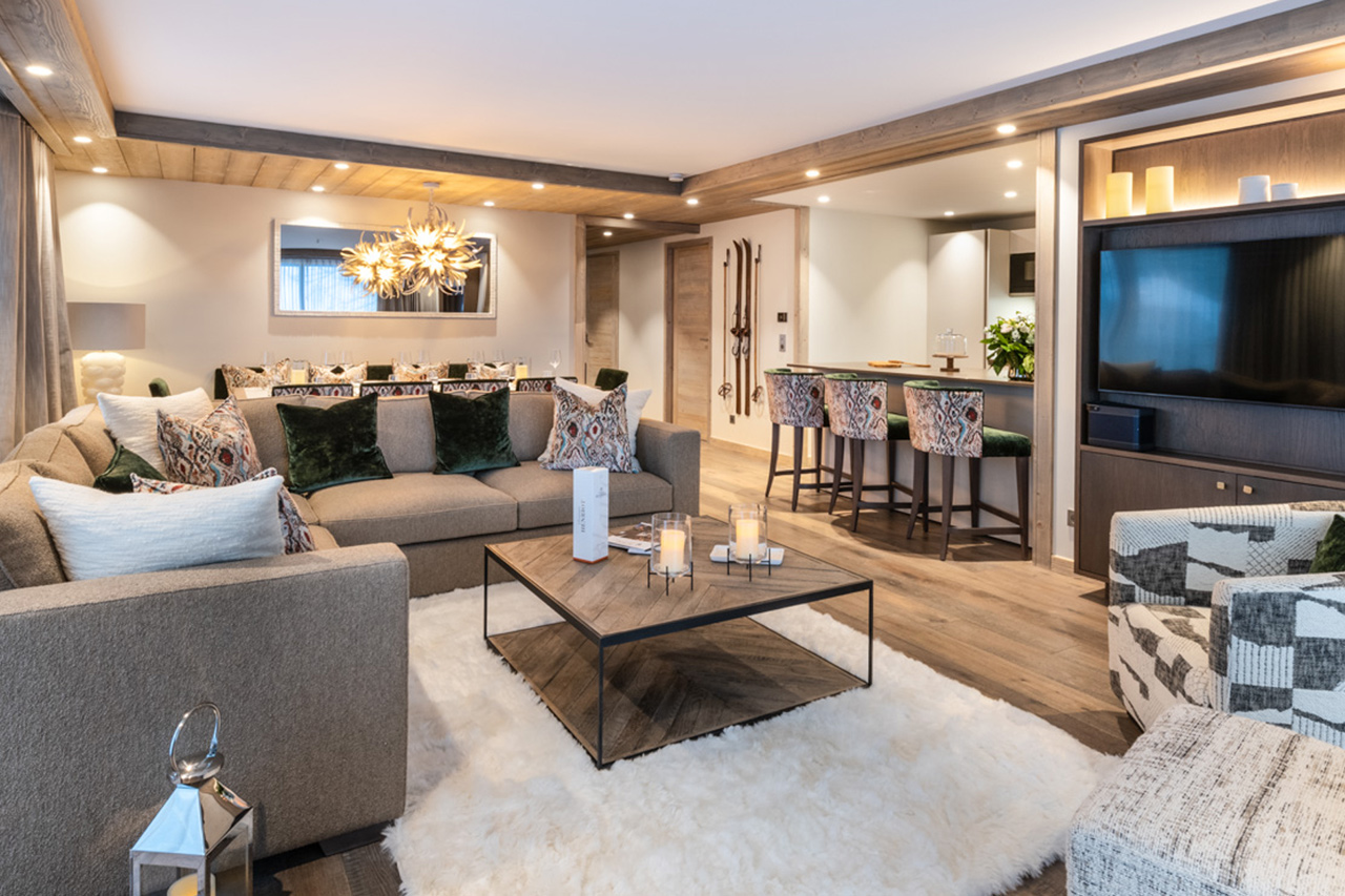 At the heart of the apartment is a welcoming open-plan living space, where comfortable sofas are set around the fireplace, and sliding doors open onto two furnished balconies with mountain views. A dining table for ten sits beneath statement lighting, while the fully-equipped kitchen includes a breakfast bar for casual seating.