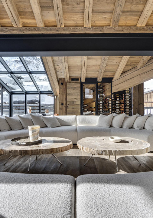 The impressive living area occupies the top floor, where floor-to-ceiling windows frame panoramic views of the surrounding peaks. Exposed beams accentuate the dramatic roofline, while curved sofas gathered around the fireplace create a cosy space to unwind.
