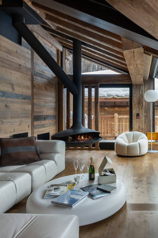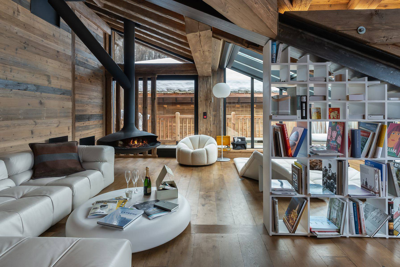- Spend time in the top-floor living space with vaulted ceilings and floor-to-ceiling windows, showcasing iconic contemporary design pieces alongside alpine materials.