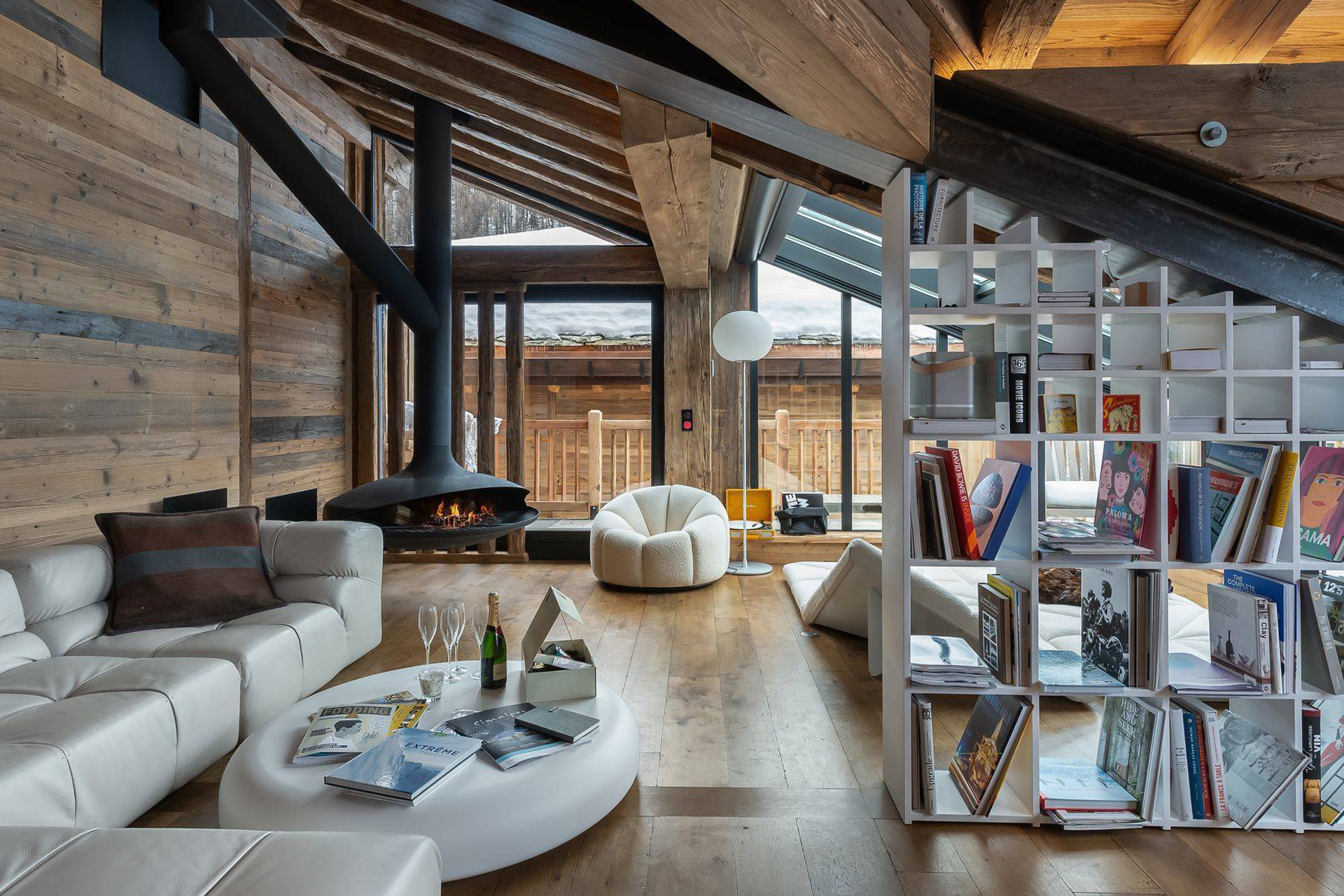 The top floor of the chalet is home to an incredible open-plan living area with a vaulted ceiling and floor-to-ceiling windows letting in an abundance of natural light.