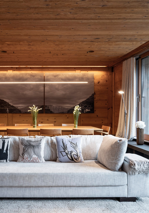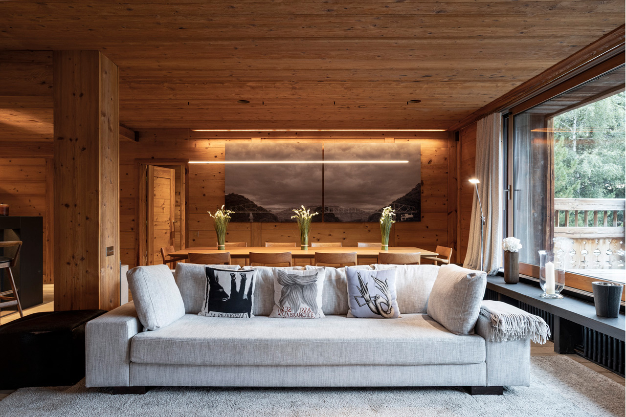 Located on the first floor, the elegant open-plan living area forms the heart of the chalet. Floor-to-ceiling windows flood the space with natural light and open onto a large furnished balcony, perfect for