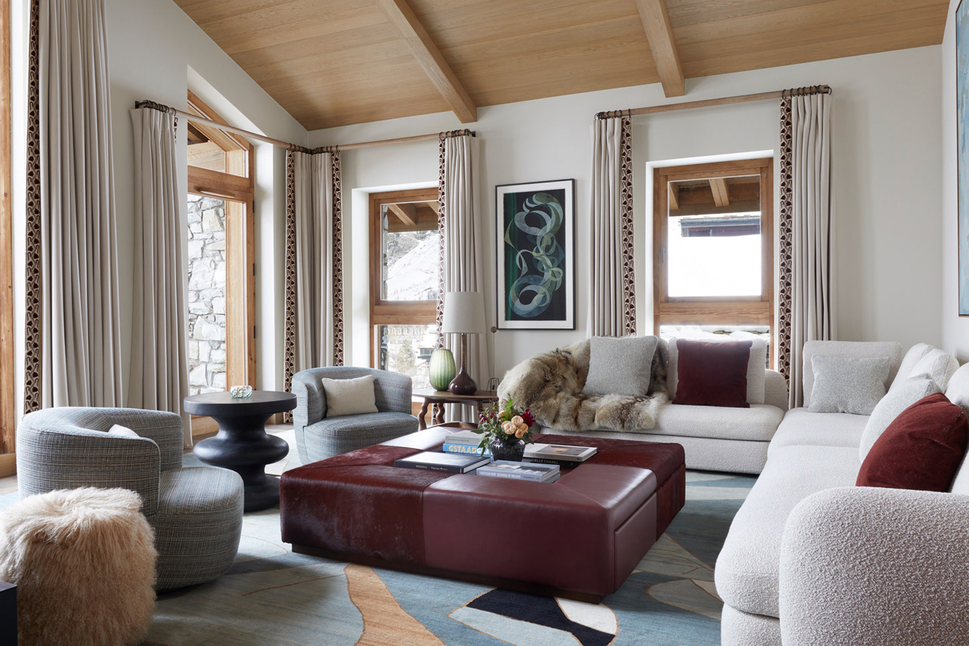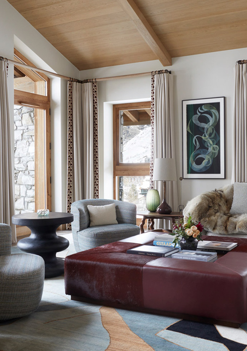 The lodge features a cosy cinema room, where the made-to-measure sofa and large screen create an immersive experience, keeping the entire family entertained. Other facilities include a ski room and an outdoor seating area.