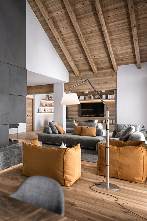 Inside, the chalet features warm wood panelling, bespoke furnishings, and floor-to-ceiling windows that frame spectacular mountain views. The main living areas are designed for both
