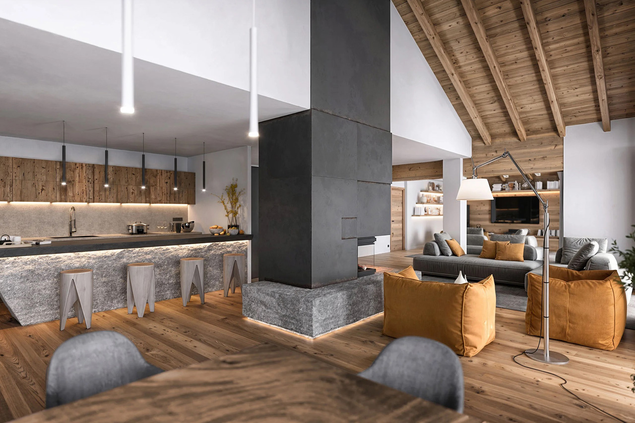 Open-plan living area at Chalet Breithorn in Cervinia