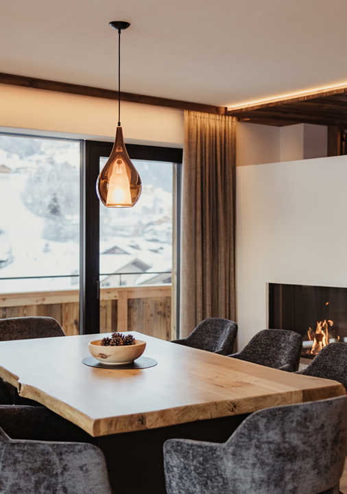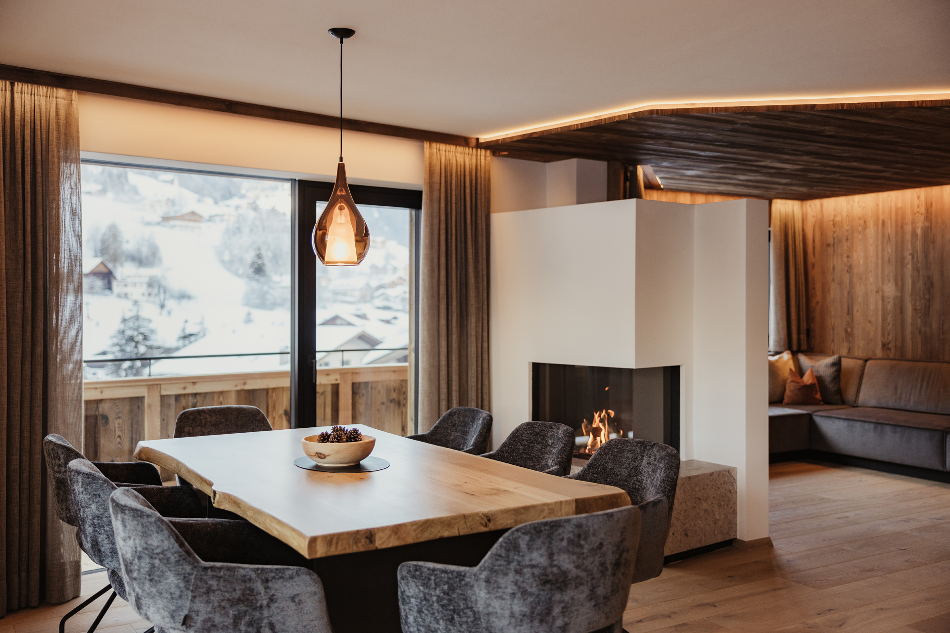 relaxing after a long day on the slopes, the crackling fireplace bestows warmth into the room, whilst the expansive windows flood the space with natural light. Unwind in the cosy sofa nook, gather around the elegant dining table, and enjoy the modern and well-equipped kitchen.