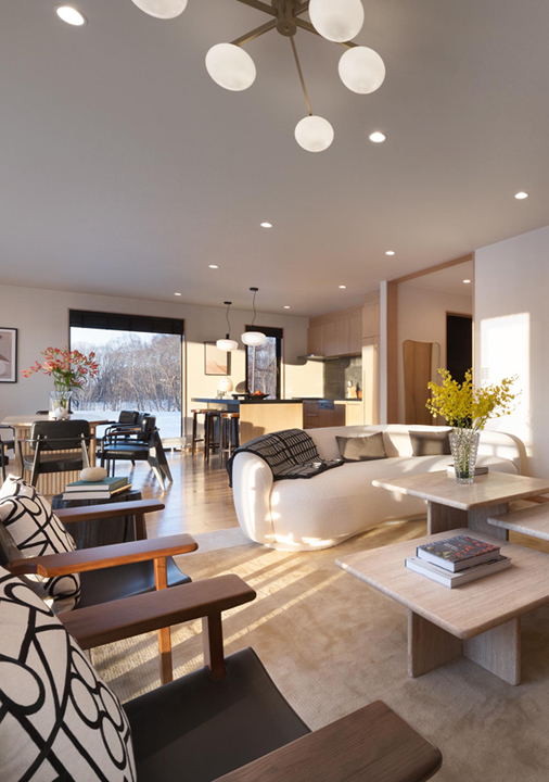 A contemporary forest retreat with serene interiors and breathtaking views of Mount Yotei.