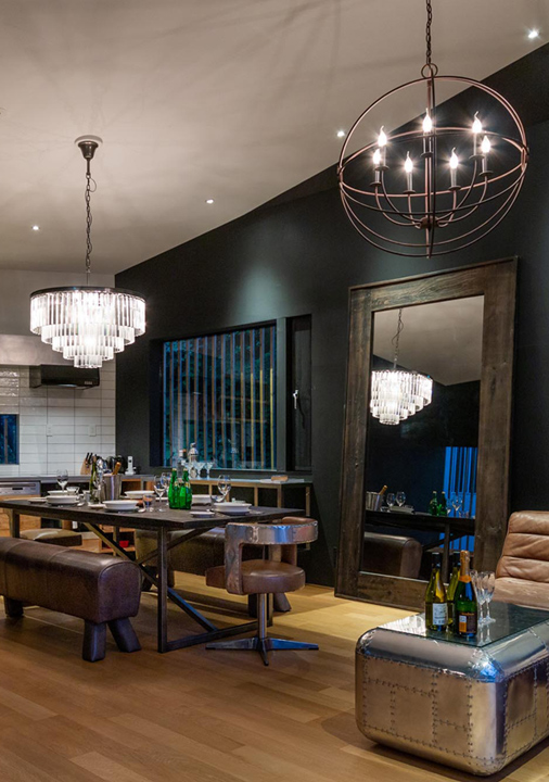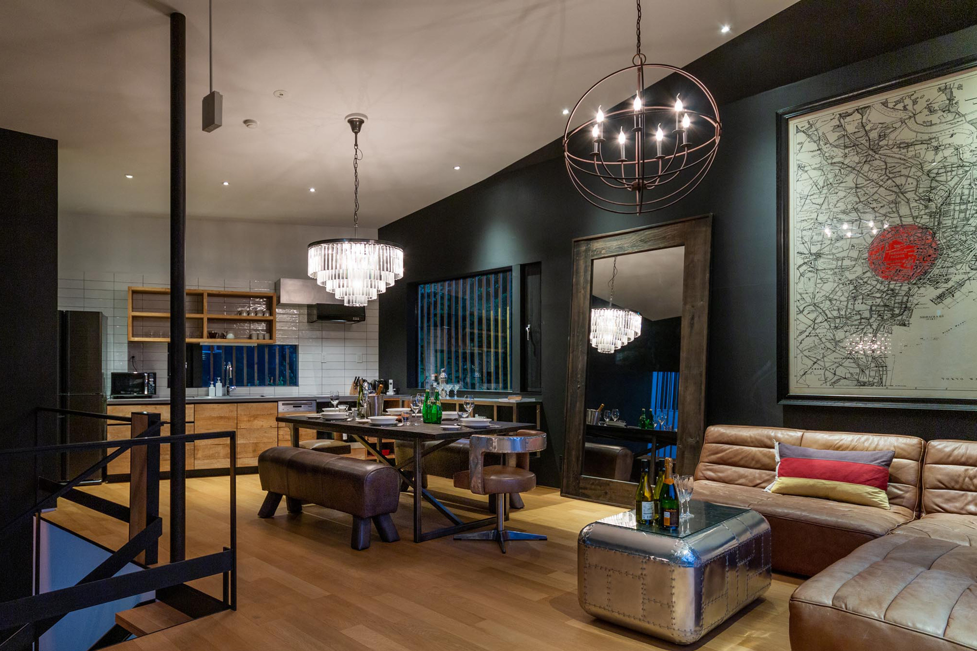 The open-plan living space is quirky and chic, carefully styled with furniture, wall art and fittings sourced from the Timothy Oulton collection. The space includes a well-equipped kitchen, elegant dining table, and cosy sofa area from which you can enjoy stunning views of Mount Yotei.