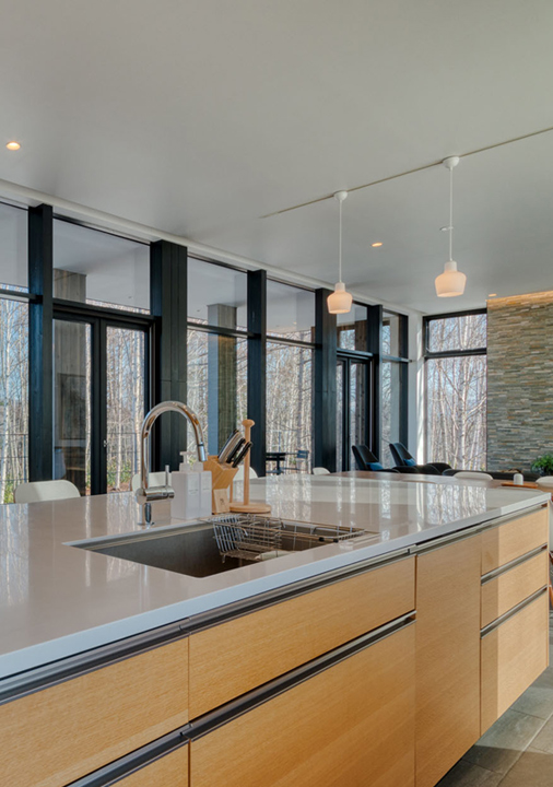 Surrounded by floor-to-ceiling windows, the open-plan living space has a calm and tranquil atmosphere. Enjoy an aprés-ski drink next to the fireplace, gather around the dining table with your friends and