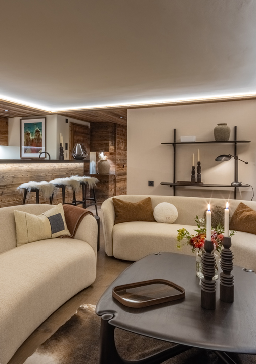 Designed for year-round living, this space combines rustic alpine details with modern furnishings to create a warm and elegant atmosphere.