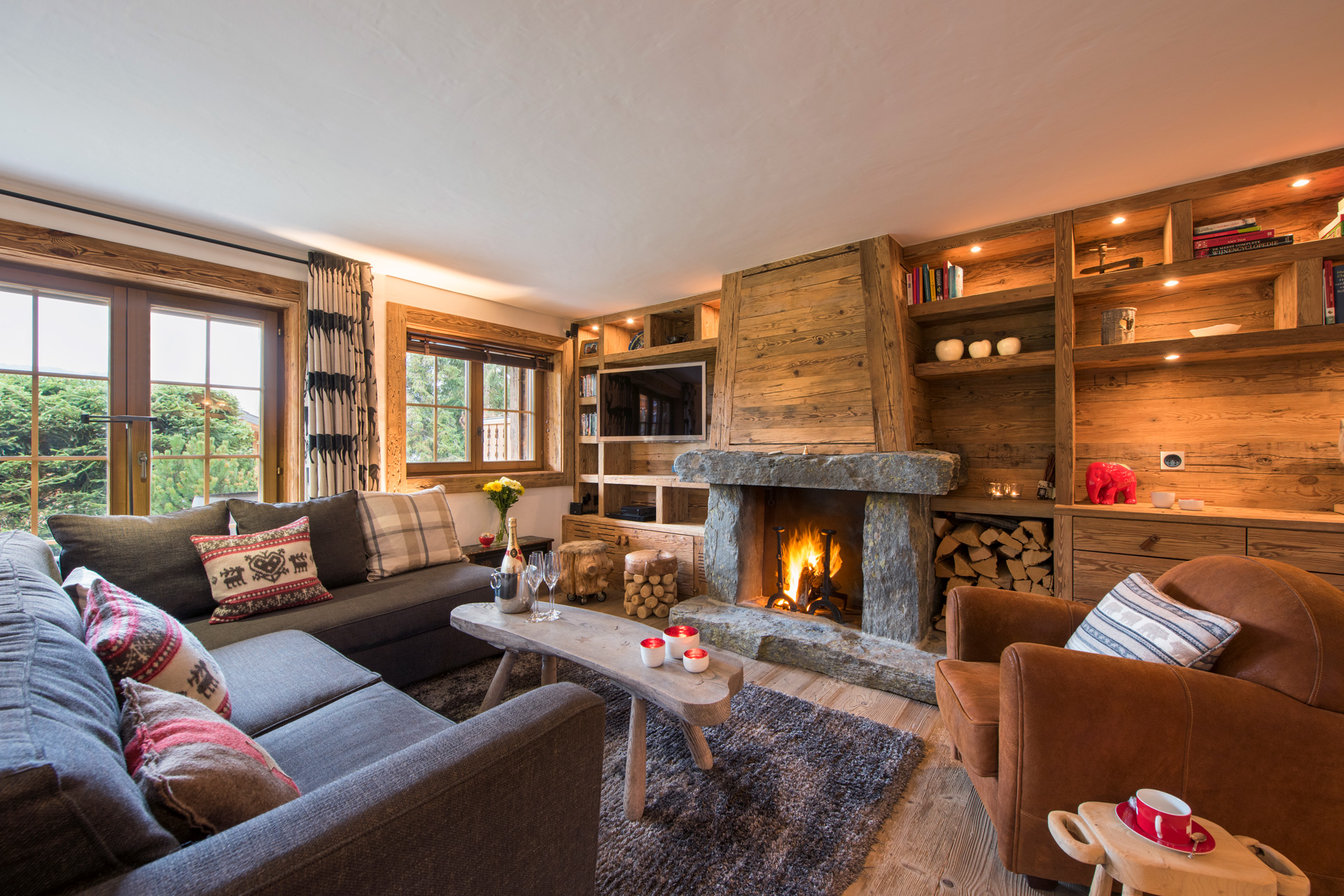 An open-plan living and dining area with a stone fireplace, TV and inviting sofas provides the perfect spot to relax after a day on the slopes.