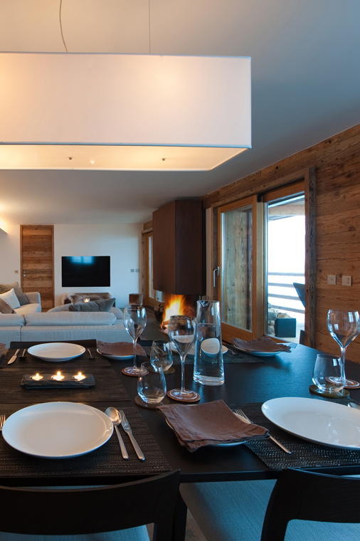 The spacious open-plan living area provides the perfect ambience for relaxation, with an ‘L’ shaped sofa, feature fireplace, dining table and state-of-the-art, fully-fitted kitchen. Large windows provide a breathtaking mountain backdrop and music can be played through ‘invisible’ speakers too, adding to the warm ambience.
