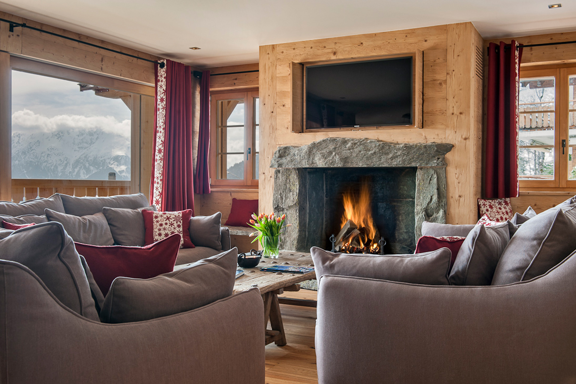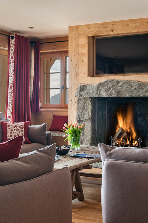 - Inside, a bright open-plan living area with a charming stone fireplace captures classic chalet charm.
