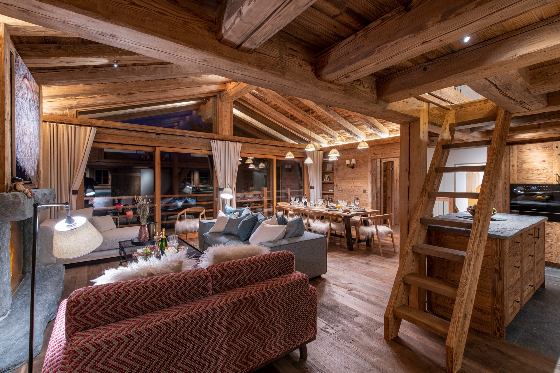 The entrance porch on the top floor of the chalet leads into a beautiful open-plan living and dining area with a double-height vaulted ceiling, exposed timber and a rustic stone fireplace.