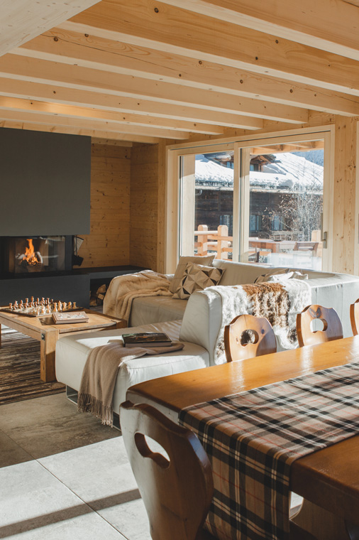 Set over three floors, the chalet is light and spacious with a large open-plan living and dining area. Floor-to-ceiling windows allow for natural light to flood in, whilst a modern fireplace creates a cosy ambience to relax in.