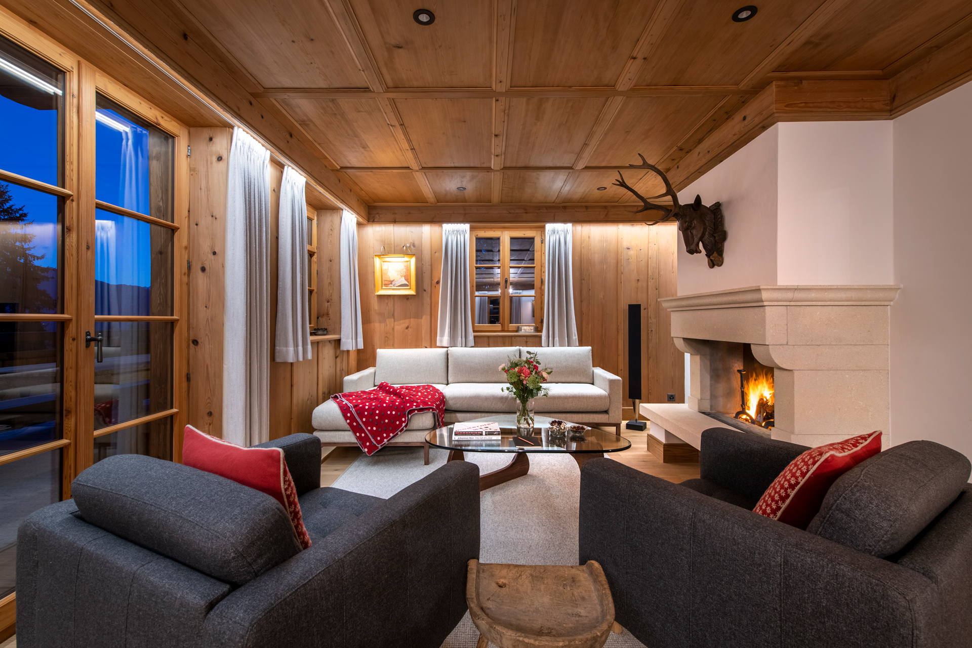 Living room at night at Chalet Tire Bouchon in Verbier2 / 6