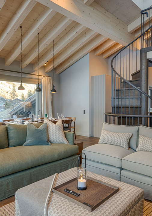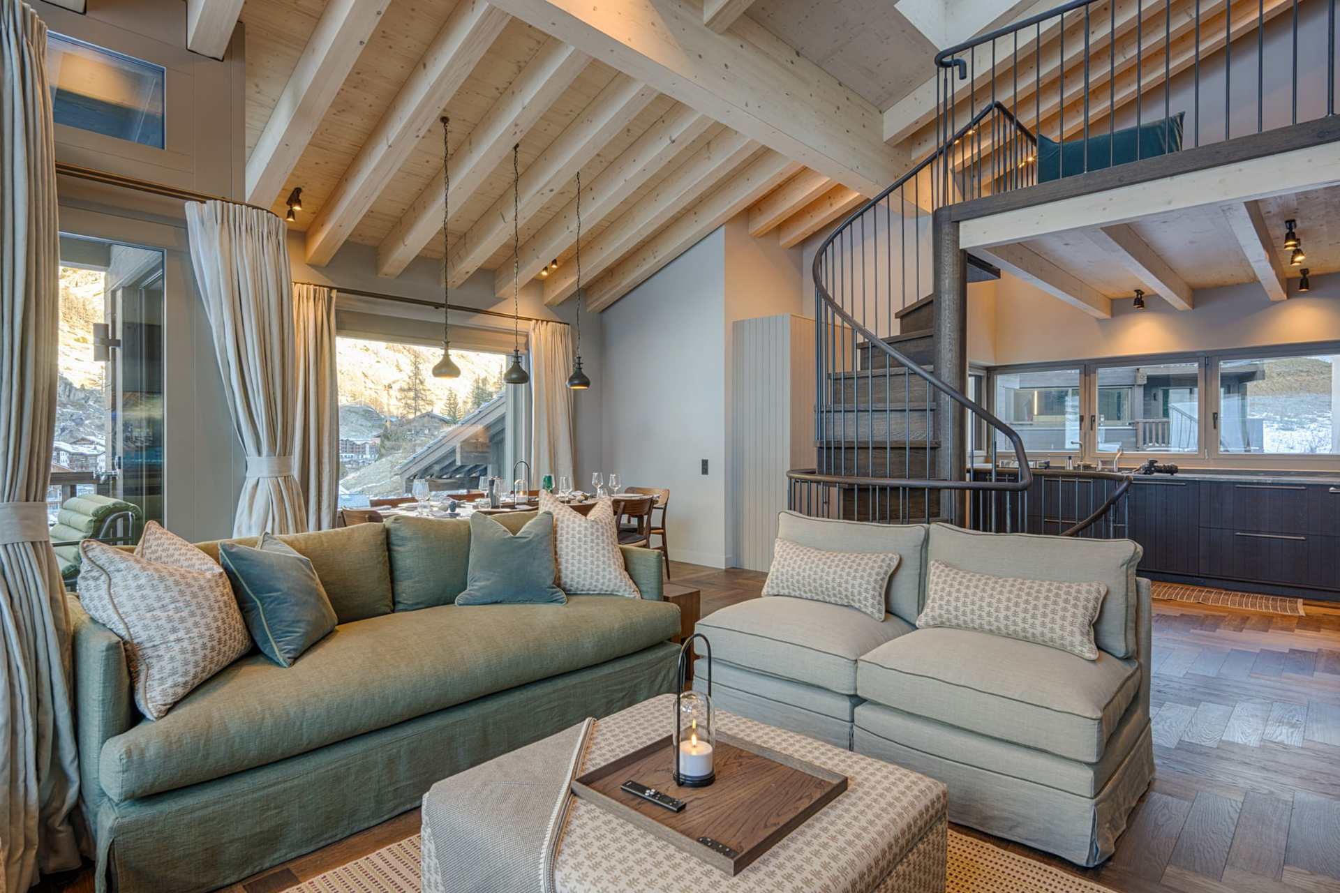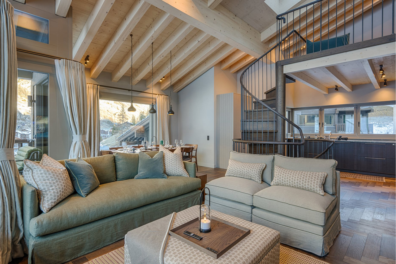 and frame the surrounding mountain views. Comfortable sofas are arranged around the fireplace and OLED TV with a sound bar, while a walnut Carl Hansen dining table alongside seats up to twelve guests. The open kitchen sits alongside, finished with birch wood surfaces and Zug appliances. A spiral staircase leads up to a quiet mezzanine level, providing an additional seating area with a sofa bed and TV.