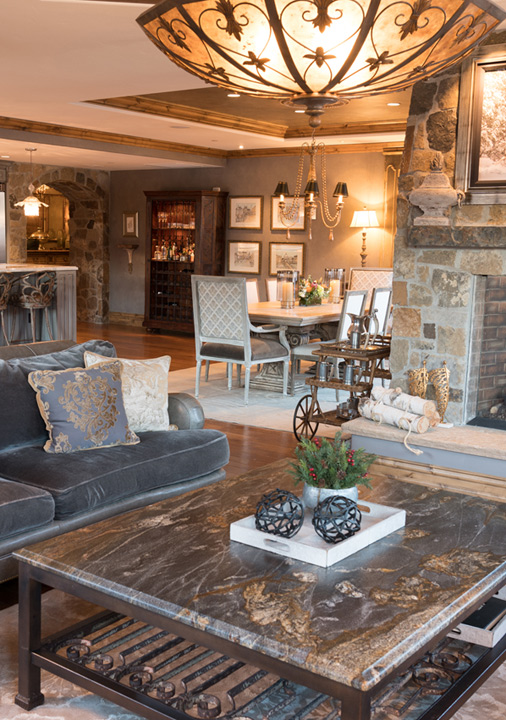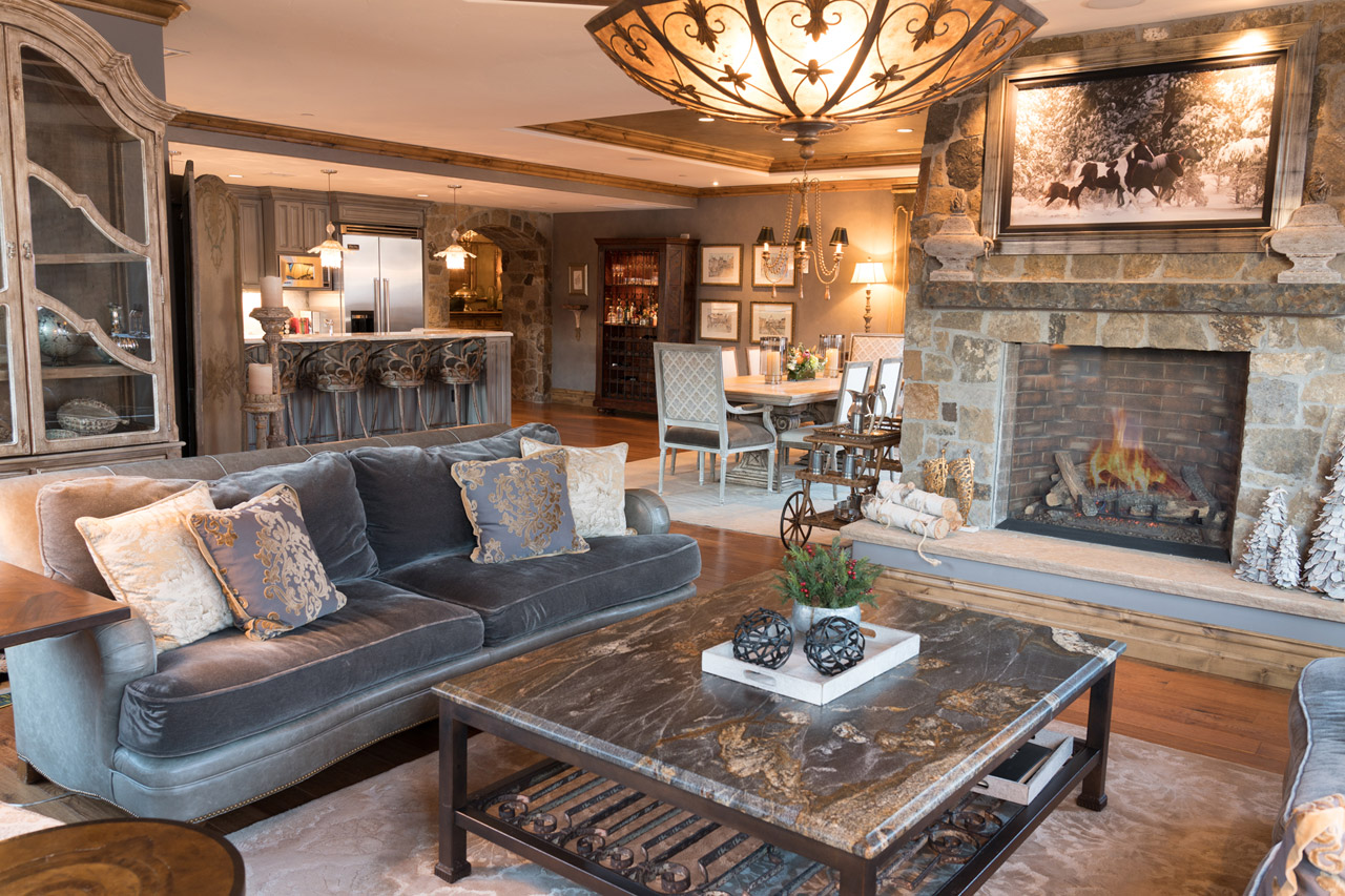 a gas grill and al fresco dining area. Comfortable seating is positioned around the custom stone fireplace and there's a formal dining area seating eight. There is also a professional kitchen with stainless steel appliances and a marble breakfast bar.