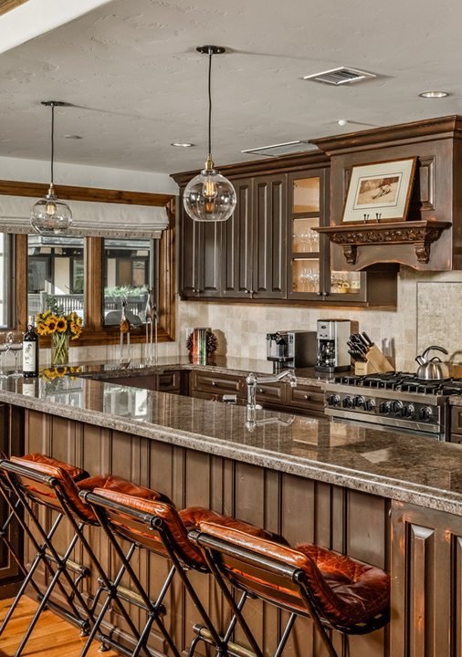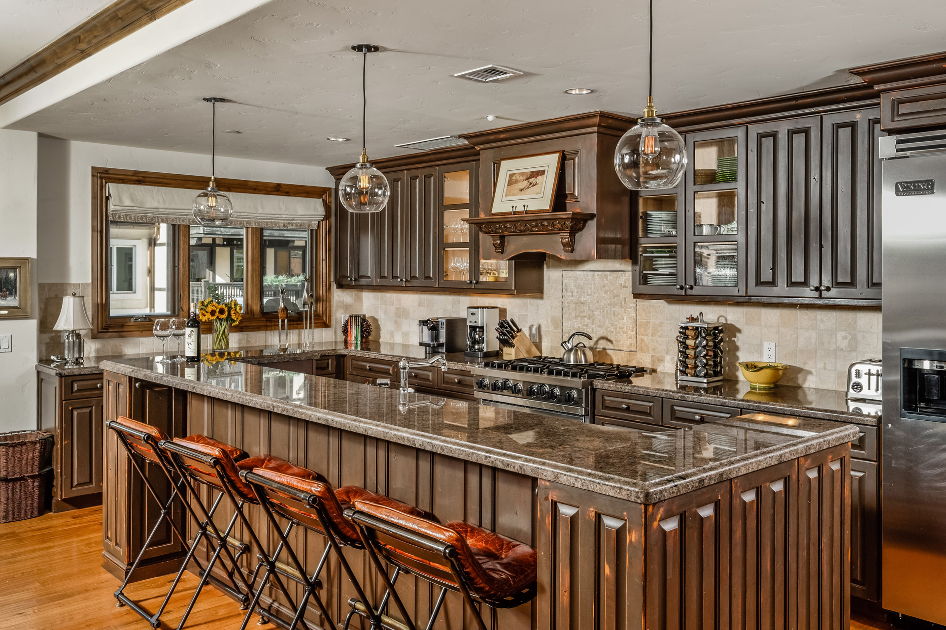 fireplace. A formal dining area, seating eight, features a hand-crafted walnut table and a fully-stocked wine cave. The kitchen offers bar seating and is fully-equipped with stainless steel appliances and well-stocked cupboards.